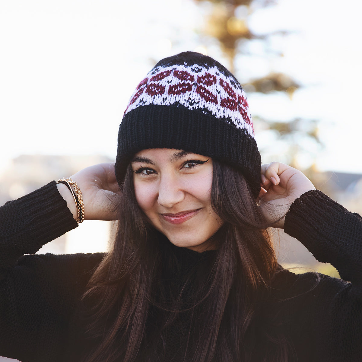 The Crosspoint Beanie is knit in the round from the bottom up, starting with an extra-long ribbed brim that you can fold over for added warmth. From there, the hat moves into a bold three-colour fair isle section that creates a clean, modern look. It’s finished with simple crown shaping for a comfortable fit that sits nicely without feeling too tight.
